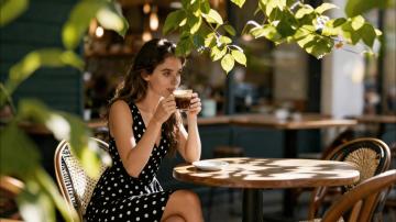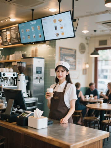 现代简约咖啡馆,清新舒适实景感,员工微笑服务,体现简约主义风格。