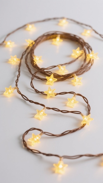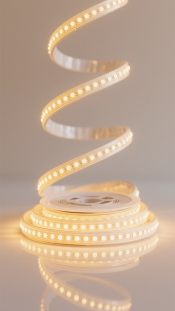 深灰色背景上,悬挂着多条柔软的白色电线,电线上点缀着许多圆形的暖黄色灯带,灯带发出柔和且带有轻微光晕的光芒,部分灯带因光线强度不同而呈现出大小不一的光斑效果,整体营造出温馨浪漫的夜晚氛围,画面简洁而富有层次感,光影对比柔和。