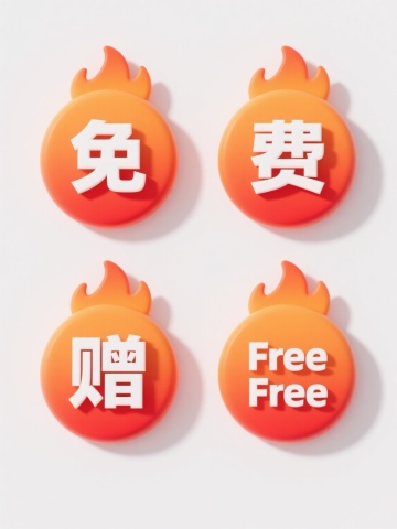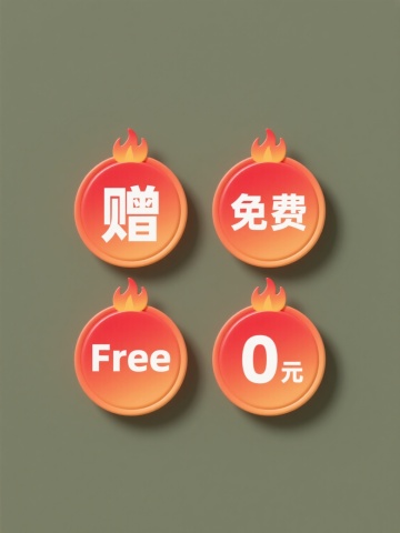 四个规整排布的圆形图标,每个图标都具有光滑的渐变色彩和火焰状顶部,内部包含不同的白色粗体汉字,分别为“赠”、“惠”、“礼”、“享”,整体采用相同的3D立体风格和光影效果,每个图标使用完全不同的纯色背景和渐变色调,保持元素类目和设计感的一致性。