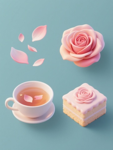 软3D风格,纯色背景,画面整体变换为柔和的粉紫色调,规整排布四个完全不同元素内容的系列素材集合。左上角是一片细腻饱满的玫瑰花瓣,展现出柔和的曲面和清晰的纹理;右上角是一朵完整绽放的玫瑰花,花瓣层层叠叠,形态优雅自然;左下角是一杯精致的玫瑰花茶,茶水清澈,漂浮着几片玫瑰花瓣,茶杯造型简约;右下角是一块诱人的玫瑰糕点,表面光滑,点缀着细小的玫瑰碎屑,整体设计简洁大方,每个元素都保持着统一的软3D质感和光影效果,视觉层次分明,信息传达清晰。