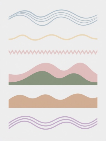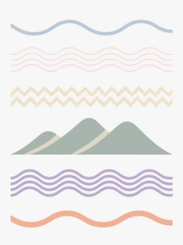 极简主义风格的系列波浪线条设计素材集合,纯净白色背景,六个完全不同造型的波浪元素以规整的垂直排列方式呈现。第一个是纤细流畅的连续波浪线,采用柔和的莫兰迪浅灰蓝色;第二个是中等粗细的平缓波浪线,选用低饱和度的莫兰迪淡粉色;第三个是细密紧凑的锯齿状波浪线,为雅致的莫兰迪米黄色;第四个是粗实的山形波浪纹,呈现温润的莫兰迪灰绿色;第五个是宽阔的波浪底纹,采用沉稳的莫兰迪淡紫色;第六个是带有微妙弧度变化的粗波浪条,为柔和的莫兰迪浅橙色。所有波浪线条边缘清晰锐利,色彩过渡自然,整体保持简洁、清晰、专业的设计感,无任何文字或装饰元素干扰。