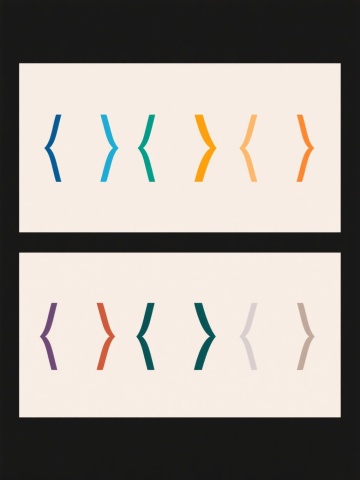 白色背景上,六个不同配色的括号造型,分为上下两行对齐排列,每个括号造型都具有独特的线条设计,包括直线型、曲线型、尖角型等多种类型,色彩鲜明且与浅色背景形成良好对比,整体呈现出简洁、清晰的设计感,线条流畅,造型各异,排列整齐有序。