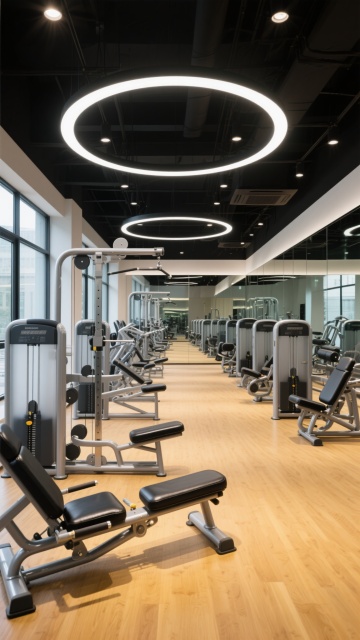 现代风格健身房内部场景,专业健身器材区,整体采用黑、白、银灰为主色调,搭配木质地板增添温暖质感。天花板悬挂多个圆形白色LED照明灯具,形成层次感光影效果,光线明亮均匀。墙面装有大面积镜子,反射空间增强视觉开阔感。主要健身器材更换为:多功能史密斯机、坐姿腿屈伸训练器、蝴蝶式胸肌训练器,均为银灰色金属框架搭配黑色皮质坐垫,设计简洁现代,器材排列整齐有序,背景可见部分哑铃架和落地窗,窗外有自然光线透入,整体氛围专业、整洁、充满力量感,适合健身运动主题的空间展示。