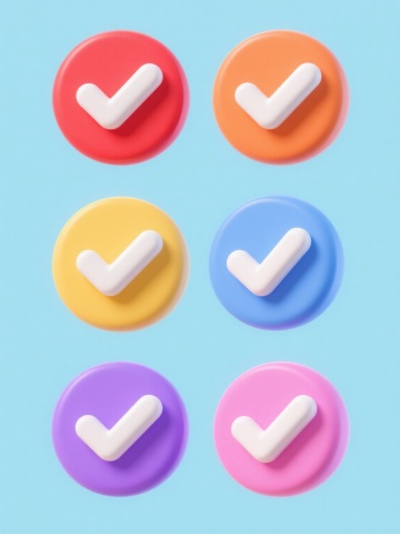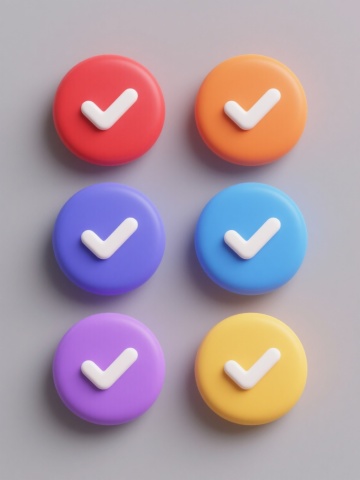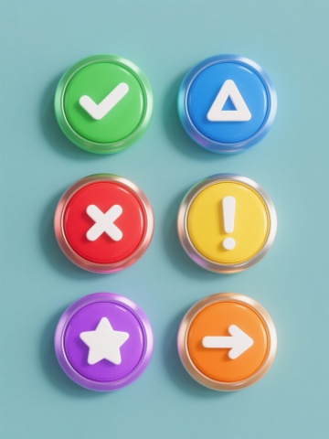 6个不同颜色的圆形按钮图标,每个按钮具有光滑的渐变金属质感和圆形高光,按钮内分别包含不同的白色简洁符号:绿色对勾、红色叉号、蓝色三角形、黄色感叹号、紫色星形、橙色箭头,所有按钮整齐排列在纯色背景上,保持统一的3D立体风格和光影效果