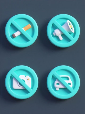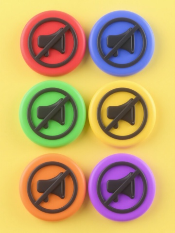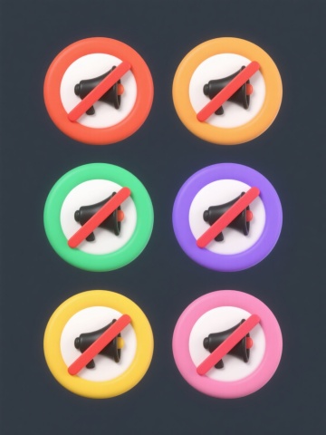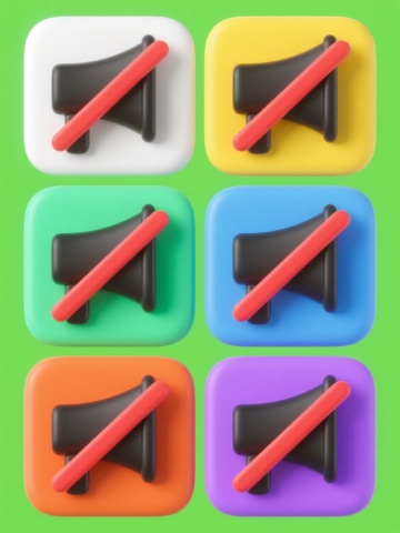 一组六个规整排布的软3D图标集合,每个图标均为相同的"禁止发声"符号(圆形边框内有一个喇叭图案被斜杠贯穿),保持一致的圆润边缘、轻微立体凸起质感和简洁现代设计风格,分别采用纯红色、纯蓝色、纯绿色、纯黄色、纯紫色、纯橙色的纯色背景与同色系图标填充,整体呈现出色彩明快、视觉统一且富有层次感的系列素材效果。