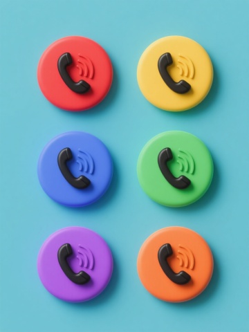 软3D风格的电话图标系列素材集合,包含六个相同元素内容但完全不同颜色的图标,每个图标均为一个黑色电话听筒图案置于圆形轮廓内,带有信号波纹设计,规整排布在纯色背景上,第一个图标背景为红色,第二个为蓝色,第三个为黄色,第四个为绿色,第五个为紫色,第六个为橙色,整体保持简洁现代的设计感,色彩鲜明且对比强烈,图标排列整齐有序,形成统一协调的系列视觉效果。