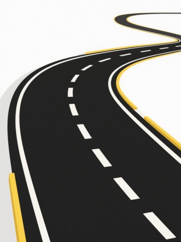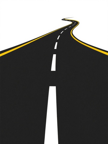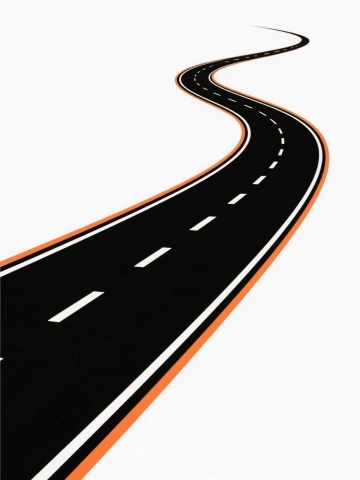 3D渲染风格的蜿蜒黑色沥青道路,道路中央有白色虚线分隔,两侧有白色实线边界,整体呈现流畅的S形曲线,从画面底部延伸至远方消失点,道路边缘有轻微的阴影增强立体感,纯白色背景,干净简洁的现代设计感,无任何多余元素,符合现实道路比例和透视逻辑,适用于背景素材使用的极简风格道路场景。