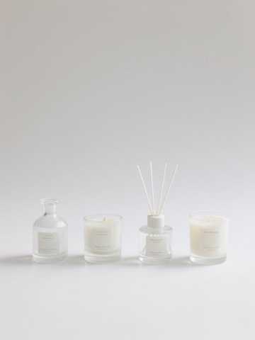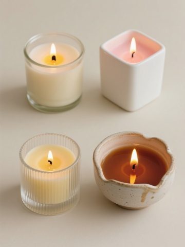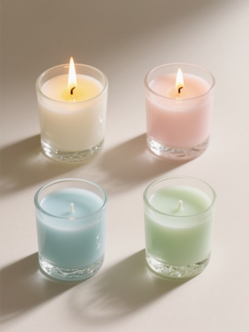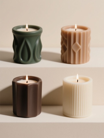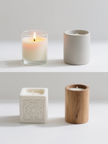 一组4个不同配色、不同样式、不同材质的蜡烛造型,符合现实逻辑,上下两行对齐排列,浅色背景,每个蜡烛均有燃烧的黄色火焰和黑色灯芯,蜡烛主体呈现不同颜色,搭配不同材质的烛台,整体画面干净简洁,光影自然,突出蜡烛的质感和细节。