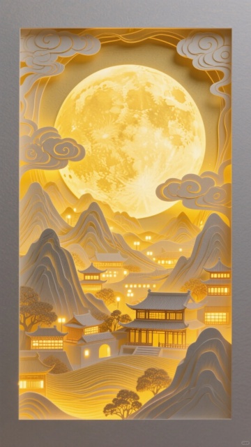 中秋主题,纸雕艺术风格,巨大圆月占据画面中心(特写镜头,皎洁通透,边缘带纸雕纹理),暖黄色调基底,工笔风格山峦叠嶂(层叠起伏,线条细腻),山峦间交织传统飞檐古建与现代民居(古今建筑融合),万家灯火呈暖黄→橙黄渐变光影(从暗到明逐层过渡,星点闪烁),纸雕镂空祥云装饰(环绕圆月与山峦边缘),整体画面以暖黄色为基底
