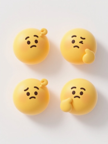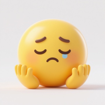 3D卡通风格黄色表情角色,整体呈圆形,主色调为明亮的黄色,带有柔和的渐变光影效果,高光位于额头、脸颊和下巴处,阴影细节丰富使角色具有立体感和软萌的塑料质感,角色双眼紧闭,眉头微微皱起,嘴角向下撇形成委屈的表情,双手掌心向上摊开在脸颊两侧,姿态显得无辜又可怜,背景为纯白色,整体氛围可爱又略带委屈,构图居中对称,视觉焦点突出。