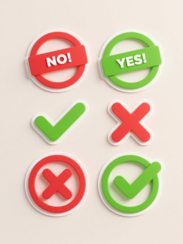 六个不同配色、不同样式的「圈勾叉」创意符号,采用上下两行三列对齐排列,浅色背景。第一行从左到右:红色圆形内有红色叉号并搭配红色「NO!」横幅标签,绿色圆形内有绿色对勾并搭配绿色「YES!」横幅标签;第二行从左到右:绿色独立对勾符号,红色独立叉号符号;第三行从左到右:红色圆形内红色叉号,绿色圆形内绿色对勾。所有符号具有鲜明的色彩对比、清晰的边缘轮廓、轻微的立体阴影效果和贴纸般的质感,整体设计简洁明了、视觉层级分明,符合信息传达高效的图标设计风格。