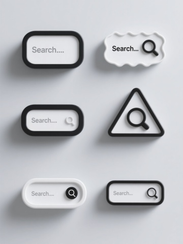 一套6个造型各异但风格统一的立体搜索框设计集合,每个搜索框均包含白色输入区域、内部显示“Search...”灰色提示文字及右侧黑色圆形放大镜图标,保持简约现代的3D视觉效果,具有微妙的阴影和高光以增强立体感,采用纯色浅灰色背景,所有元素整齐排列成规整的网格布局,每个搜索框造型在保持核心功能元素不变的前提下,通过边框形状(如圆角矩形、胶囊形、梯形、六边形、波浪边缘、轻微倾斜的平行四边形)、细节装饰(如细线条勾勒、微妙的纹理变化、局部色彩点缀)或微小结构差异实现多样化设计,整体呈现出专业、协调且富有变化的系列感。