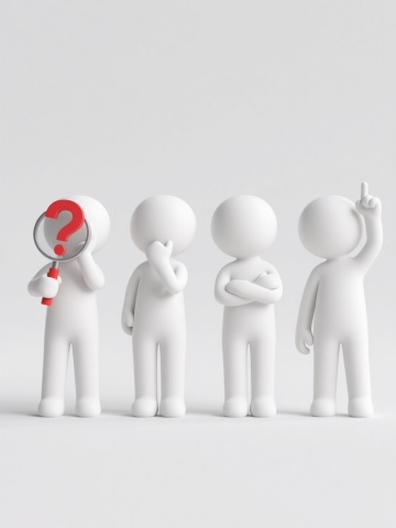 简约现代风格的四个3D白色卡通人物素材规整排布,每个角色展现不同的思考状态:手持放大镜观察红色问号、单手托腮沉思、双手抱胸点头、手指轻敲太阳穴构思。所有角色均为光滑圆润的3D建模,带有柔和高光和轻微阴影,采用纯白色人物搭配纯色背景,无任何文字、logo或水印,整体造型简洁明快,视觉层次清晰,传达专注思考的氛围。