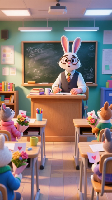 3D卡通风格,拟人兔子教师与学生互动,温馨教室氛围,表达感恩师恩主题。