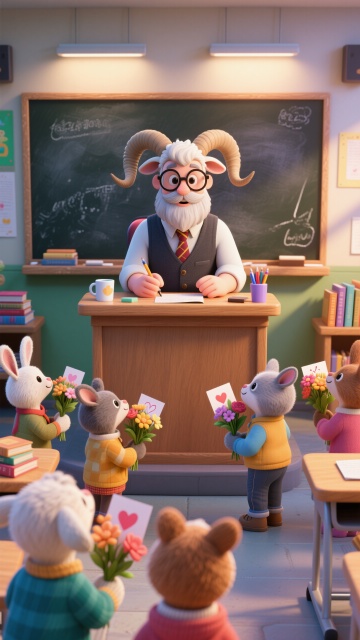 温馨软3D风教室,卡通老师手捧花束与爱心卡片,学生献礼,节日氛围浓厚。
