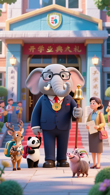 一位大象老师站在讲台,身形敦实,长鼻子自然垂下,戴细框眼镜显知性,穿浅棕色西装 + 领带,温和微笑。讲台前围绕着一群拟人化小动物学生(如兔子、小鹿 ),手持鲜花与感恩卡片,教室布置简洁明亮(黑板、课桌椅)