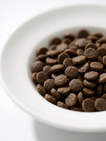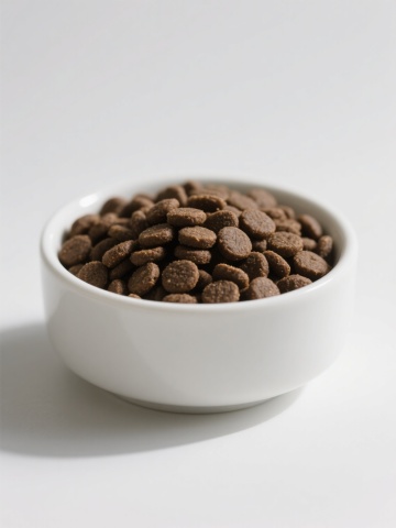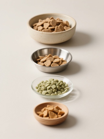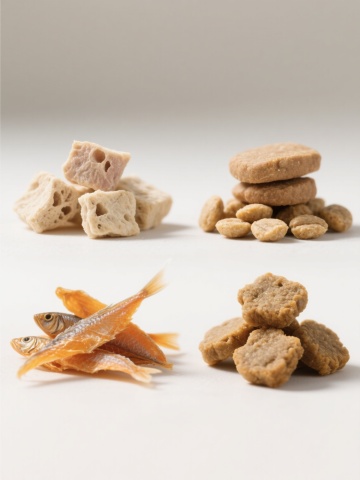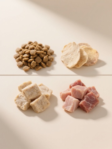 俯视角,浅色背景,上下两行各两个不同样式、不同材质、不同造型的猫粮,上行左为光滑圆角矩形块状浅米色猫粮,上行右为细小圆形浅棕色猫粮,下行左为长条状脆片深棕色猫粮,下行右为带有橙黄色点缀的混合形态猫粮,光线柔和从上方照射,展现各猫粮表面细腻高光与自然阴影,突出材质和形态细节,整体干净纯粹。