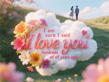 文字“我肯定 在几百年前 就说过爱你”,创意体。卡通线条粗体,花朵,柔软的云,远处隐约有一男一女,浪漫七夕氛围。