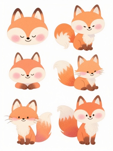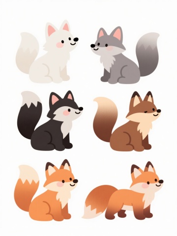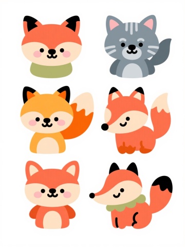 六个不同样式、不同种类、不同外观的卡通狐狸,保持与原图一致的扁平风格,圆润可爱的造型,简洁的线条,鲜艳明快的色彩,每个狐狸都有独特的特征,如不同的毛色、表情、姿态或配饰,它们整齐地排列在纯白色背景上,整体构图均衡,视觉层次清晰,信息传达直接,适合作为面向大众的可爱主题设计素材。