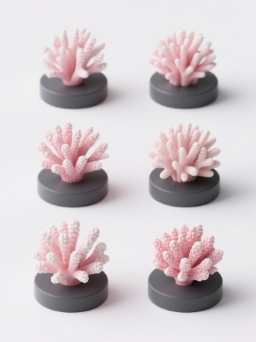 6个不同形态的粉红色珊瑚摆件,每个珊瑚具有独特的分支结构和纹理细节,底部为深色岩石底座,整体呈现写实的3D塑料模型质感,柔和的粉色渐变与白色高光过渡自然,统一放置于纯白色纯色背景上,6个珊瑚元素呈规整的2x3网格排布,每个珊瑚大小一致且间距均匀,保持清晰的视觉层次和整体平衡感