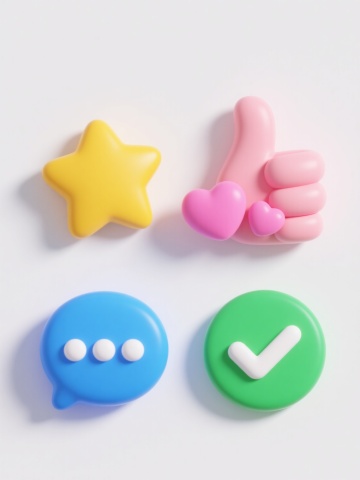 3D立体风格电商素材集合,纯白纯色背景,四个规整排布的独立元素,每个元素均采用圆润饱满的造型、柔和的渐变色彩、清晰的高光与阴影表现,呈现出光滑的塑料质感,元素包括:左侧上方为粉色点赞手势与红色爱心组合,右侧上方为蓝色购物车与黄色星星组合,左侧下方为绿色包裹盒与橙色箭头组合,右侧下方为紫色信用卡与白色对勾组合,整体构图平衡对称,视觉层级分明,符合电商促销氛围,信息传达简洁直观。