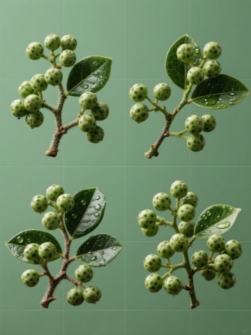 白色纯色背景上,以高清晰写实风格展示四个完全不同造型的花椒枝元素集合,每个花椒枝保持真实的红色花椒果实、深绿色带黄色叶脉的叶片和深褐色枝干特征,造型分别为:1. 向上延伸的舒展枝丫,果实密集分布于顶端;2. 弯曲下垂的优雅形态,果实自然垂落;3. 对称平衡的放射状结构,枝干向左右均匀展开;4. 紧凑饱满的团簇造型,枝干短而果实密集。四个元素呈2x2规整网格排布,间距均匀,整体保持一致的光影效果,高光位于果实顶部,阴影自然投射于背景,色彩鲜艳饱和,细节清晰,具有强烈的真实质感和统一的视觉风格。