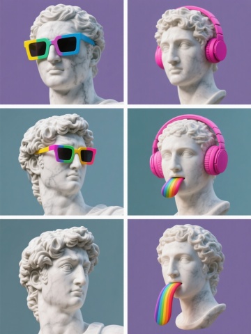古典主义大理石雕塑风格,六个人物半身像雕塑系列集合,每个雕塑均具有细腻的卷发、花朵装饰发饰和古典衣袍褶皱,整体画面采用纯色背景,六个雕塑呈规整网格排布,每个雕塑分别呈现不同的人物面容特征,保持统一的古典优雅氛围与精致的大理石纹理质感,光影柔和,高光与阴影过渡自然,整体色彩变换为柔和的多色调系列,每个雕塑拥有独特而协调的色彩,共同构成和谐统一的视觉集合。