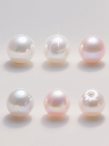 6个不同样式与光效的珍珠素材造型,采用写实风格,珍珠呈现柔和的白色与淡粉色渐变,表面光滑细腻,带有自然的珍珠光泽与细微的晕彩。每个珍珠拥有独特的光影效果:有的顶部有明亮的高光点,有的侧面有柔和的侧光,有的底部有淡淡的阴影,有的整体呈现均匀的漫反射光泽,有的带有局部的光斑折射,有的则有微妙的光影层次变化。所有珍珠排列在纯净的浅色背景上,分为上下两行整齐对齐,构图简洁,突出珍珠的质感与光影美感,整体画面干净、雅致,具有珠宝产品展示的精致感。