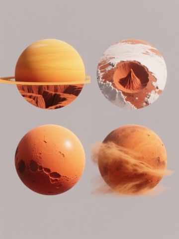 一张系列素材集合海报,采用纯色背景,保持原图中火星的3D立体风格、橙黄色渐变色调、细腻的陨石坑纹理和光滑的星球表面质感,光影呈现从亮黄色高光到橙红色阴影的自然过渡。画面中规整排布四个完全不同造型的火星元素:第一个是带有明显赤道隆起和深邃峡谷的火星;第二个是表面覆盖部分冰霜、极地有白色冰盖的火星;第三个是被巨大环形山环绕、中心有火山锥突起的火星;第四个是呈现局部沙尘暴效果、表面有模糊尘埃纹理的火星。每个火星都保持圆形轮廓,大小一致,以两行两列的对称构图排列,整体设计简洁大气,视觉层级清晰,能快速传达火星多样性的主题。