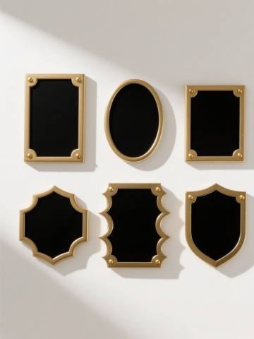 白色背景上,6个不同样式、不同风格、不同材质的门牌排列整齐,每个门牌都具有精致的金属质感和光泽,有的呈现出金色的拉丝纹理,有的则带有复古的雕花边框,整体设计简洁而不失典雅,光线从上方照射下来,在门牌边缘形成柔和的阴影,营造出立体而庄重的氛围。