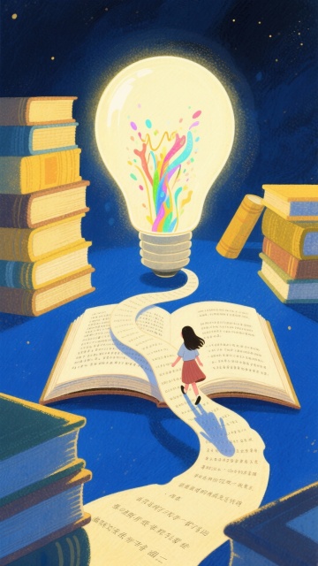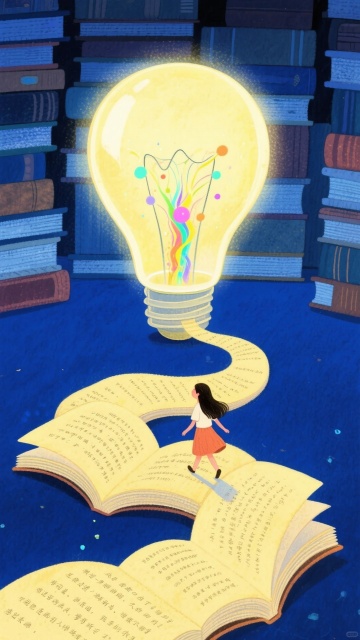 梦幻感插画风,微缩艺术视角下,女孩行于书页小径,通向发光灯泡,水彩晕染与光影交织,超现实主义构图,点亮知识之梦。