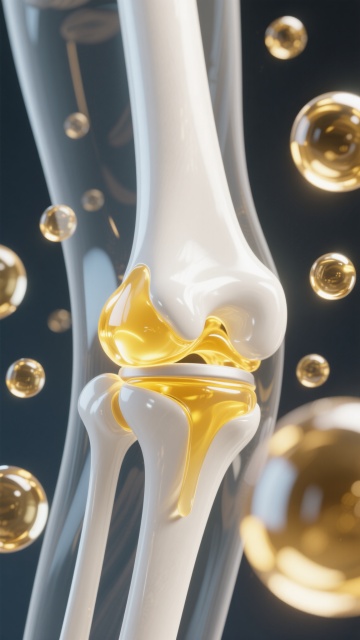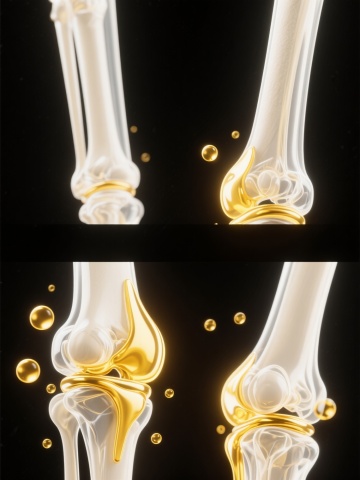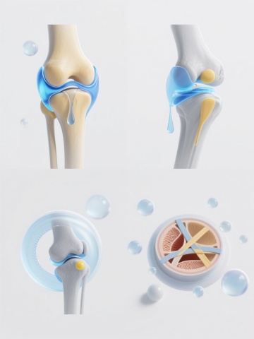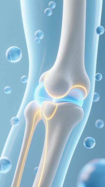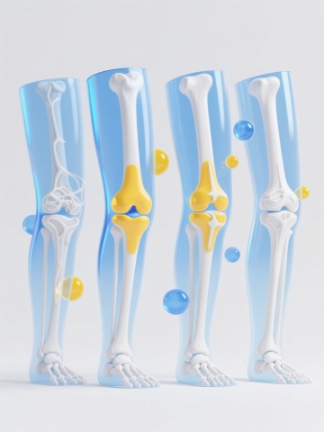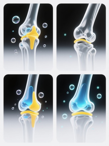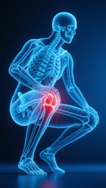 3D渲染的人体医学骨骼示意图,采用蓝色网格线勾勒骨骼结构,膝盖关节处有明亮的红色和黄色高光突出显示,深蓝色渐变背景营造出科技感和医疗专业氛围,骨骼边缘有红色线条增强立体感,整体呈现半透明的X射线透视效果,光线从关节处向外发散形成光晕,画面聚焦于人体膝盖部位的骨骼细节和疼痛点高亮显示,具有清晰的解剖学准确性和视觉冲击力。