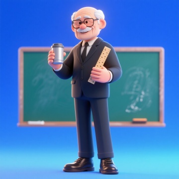 中年男教师(胖胖的,拿烧杯,穿皮鞋),全身,元素完整。蓝色渐变背景