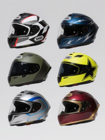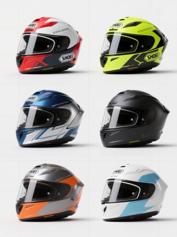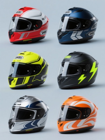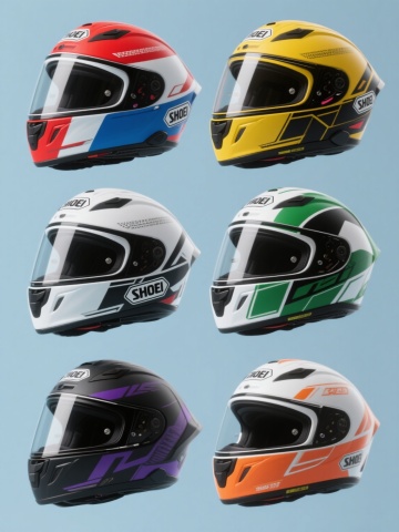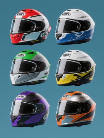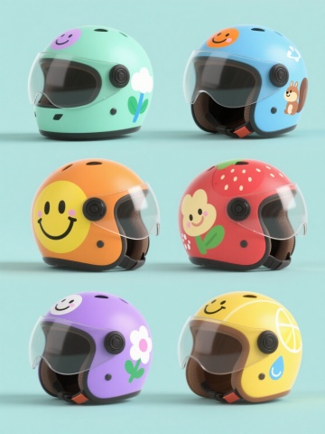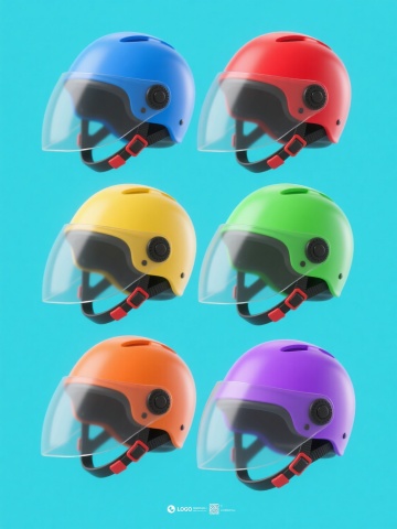 六个不同颜色的软3D风格头盔系列素材集合,每个头盔保持相同的圆润造型、透明面罩、黑色系带和红色卡扣细节,分别呈现纯红色、纯蓝色、纯黄色、纯绿色、纯紫色和纯橙色,均置于纯色背景上,整体采用规整的2x3网格排布,光影柔和,色彩鲜明,具有统一的现代产品展示设计感