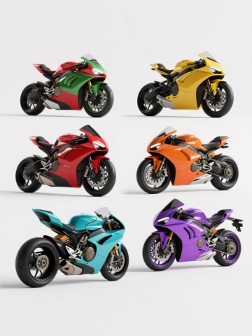 六个不同造型的运动摩托车系列素材集合,每个摩托车保持现代3D渲染风格和高细节金属质感,分别采用红色、绿色、黄色、橙色、紫色、青色为主色调,黑色为辅色,均以45度角侧视图呈现于纯白色纯色背景上,摩托车的流线型车身、锐利车头灯、合金轮毂和黑色座椅等细节清晰可见,六辆摩托车呈2行3列规整排布,整体画面干净简洁,具有强烈的视觉冲击力和系列感。