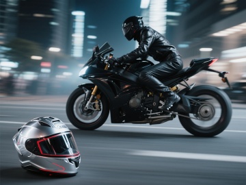 赛博朋克风夜景中,骑手疾驰于未来都市,金属质感机车与霓虹光影交织,头盔静置路面,虚实交错,科技感与酷炫感并存。