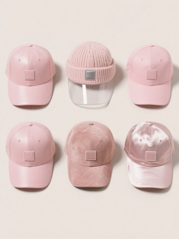 六个完全相同造型的粉色棒球帽,分别采用光滑皮革、粗针织毛线、磨砂金属、透明亚克力、绒面麂皮和亮面丝绸材质,每个帽子保留原有的缝线细节和前侧小方形贴布设计,规整排列在纯色背景上,保持产品图片的清晰光影和简洁布局,无任何文字或二维码元素。