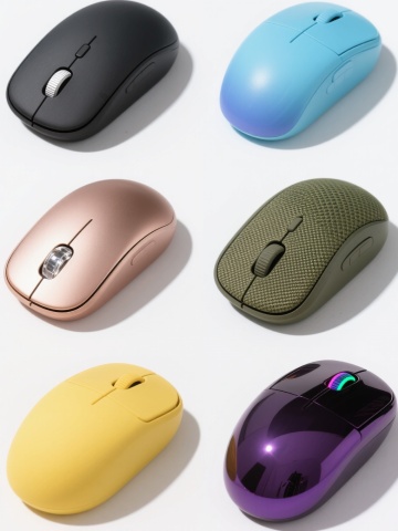 白色背景上整齐排列六个不同设计的电脑鼠标,保持原图简约圆润的基本造型和正前方视角,第一个是深黑色磨砂材质搭配银色滚轮的商务风鼠标,第二个是天蓝色光滑塑料材质带渐变效果的清新风鼠标,第三个是玫瑰金色金属质感搭配透明水晶滚轮的奢华风鼠标,第四个是军绿色帆布纹理表面带防滑纹路的户外风鼠标,第五个是亮黄色哑光橡胶材质的活泼风鼠标,第六个是深紫色镜面反光材质搭配彩色LED滚轮的科技感鼠标,每个鼠标都有细致的光影效果和清晰的材质纹理,整体呈现出产品展示图的干净明亮风格,无任何文字和标识。