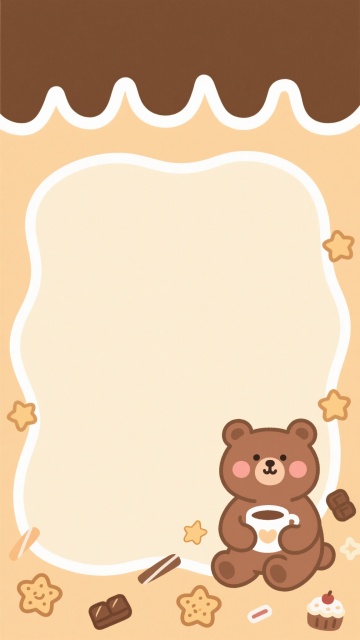可爱背景,卡通风格,柔和的米黄色和浅棕色渐变背景,顶部有深棕色波浪形装饰,白色描边线条勾勒轮廓,右下角有一只抱着杯子的棕色小熊,脸颊圆润,表情呆萌,周围散落着星星形状的饼干、巧克力棒和小蛋糕,整体画面温馨治愈,色彩明快柔和,线条圆润流畅,充满童趣,留有大面积空白区域适合作为背景使用。