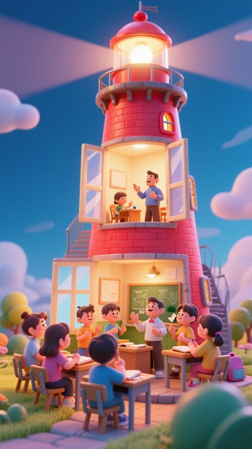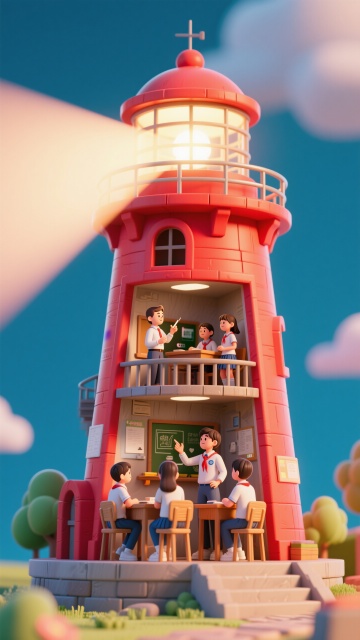 软3D风卡通感灯塔教室,梦幻温馨氛围,趣味学习场景。