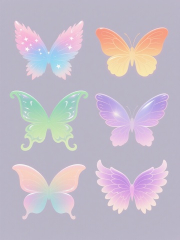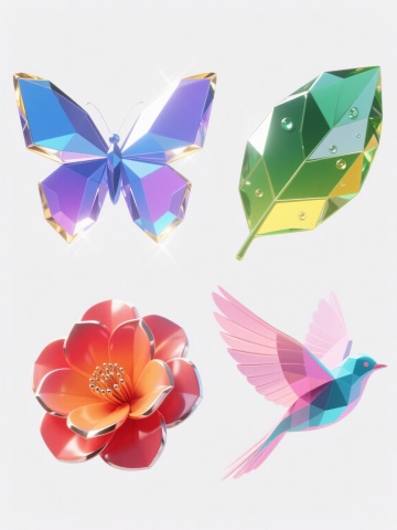 一张包含四个规整排布的不同元素集合的海报,每个元素都采用3D渲染的透明玻璃质感设计,具有棱角分明的几何切割面、光滑透亮的表面、强烈的光线折射效果和璀璨的高光点,元素类目保持为自然界生物形态,背景为纯白色纯色背景;第一个元素为蓝色与紫色渐变的蝴蝶,翅膀呈现多面体切割,边缘有金色光边,整体光影明亮通透;第二个元素为绿色与黄色渐变的树叶,叶片脉络清晰呈几何切割状,表面有露珠折射光点,光影柔和清新;第三个元素为红色与橙色渐变的花朵,花瓣层次分明且边缘锐利,花蕊部分有金属光泽点缀,光影温暖热烈;第四个元素为粉色与青色渐变的飞鸟,身体线条流畅,羽毛呈多边形片状叠加,翅膀展开有动态飘逸感,光影梦幻轻盈;整体画面风格统一,每个元素独立清晰,色彩对比鲜明且和谐,视觉层级明确,信息传达简洁高效,设计感现代时尚,符合追求精致、高端、自然与科技感融合的目标受众审美。