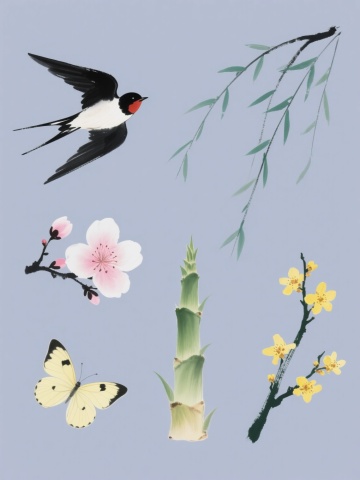 四个不同元素的水彩风格插画集合,每个元素都具有透明晕染的水彩质感,柔和的边缘过渡,丰富的色彩渐变和飞溅的颜料效果,元素分别为:色彩鲜艳的热带蝴蝶、羽毛轻盈的鸟类、盛开的花朵和游动的金鱼,每个元素都有独特的动态姿态,背景为纯色,整体色彩统一且和谐,元素排布规整对称,画面简洁明快,具有高度的视觉连贯性和设计感。