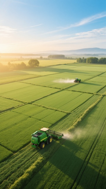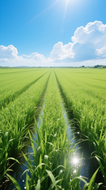 写实摄影风格,温暖明亮的金色夕阳低悬于天际,橙黄色霞光铺满天空并与云层交融,地平线处可见传统日式民居错落分布,近处广阔的绿色稻田随风轻摆,一位戴着草帽、背着竹篓的农人弯腰劳作的背影位于画面中间偏下位置,整体画面营造出宁静祥和的田园傍晚氛围,光影柔和,色彩饱和,构图采用三分法,地平线位于下方三分之一处,突出天空的壮丽与田野的生机。