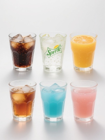 六款不同颜色透明玻璃杯装冰镇气泡饮料的系列素材集合,每款饮料颜色各异(如粉色草莓气泡水、绿色青柠苏打、蓝色蓝莓汽饮、紫色葡萄气泡果汁、红色西柚苏打水、透明柠檬气泡水),均含大量冰块和细密气泡,杯壁有水珠凝结,采用高光泽写实摄影风格,纯色背景,光线明亮柔和从顶部斜射形成高光和细微阴影,六张饮品图呈2x3网格状规整排布,整体构图对称平衡,画面简洁清爽,无任何文字和装饰元素。