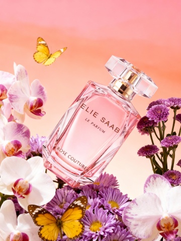 唯美感与浪漫感交织的3D重拟物风香水场景,玻璃瓶身透出柔和光影,玫瑰花瓣环绕,营造清新优雅的实景氛围。