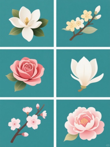 中国传统工笔花鸟画风格,白色花朵、深绿色叶子、棕色枝干,高细节线条勾勒,平滑色块填充,纯色背景,整体色彩变换,6个完全不同造型和角度的同元素系列素材集合,规整排布在同一画面中,保持工笔画的细腻笔触和淡雅配色,元素内容不变,构图整齐有序。