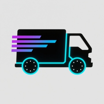 一个具有未来主义赛博朋克风格的黑色快递货车图标,货车轮廓采用锐利的几何线条设计,边缘带有霓虹蓝的发光描边效果,车身后部有由三条渐变色(从亮蓝到紫色)光带组成的速度线,车轮为黑色实心圆并点缀有细小的白色高光点,整体图标位于纯白色的纯色背景上,保持简洁的剪影形态但融入科技感十足的霓虹光效元素,呈现出既现代又富有动感的视觉效果。