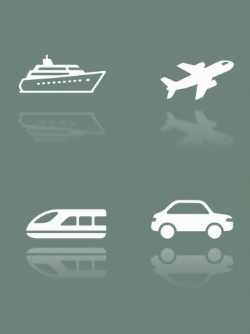 极简风格矢量图标集合,包含四个不同的交通工具图标:一艘现代游轮、一架飞机、一列高速列车和一辆汽车,每个图标均采用单一纯色填充,搭配简洁的白色轮廓线条,底部有平滑的倒影效果,所有图标在纯色背景上呈规整的2x2网格排布,整体保持统一的简约设计语言和视觉平衡感。