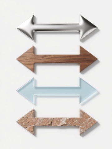 四个相同双向箭头造型元素组成的系列素材集合,水平并排规整排布,整体构图平衡对称,背景为纯白色。每个箭头采用纯色背景且整体色彩各异:第一个是具有强烈金属光泽质感的银色箭头,表面有细腻的高光反射;第二个是呈现自然木质纹理的棕色箭头,木纹清晰可见;第三个是磨砂玻璃材质的半透明淡蓝色箭头,带有柔和的朦胧质感;第四个是带有粗糙表面纹理的赭石色石质箭头,展现出石材的颗粒感。整体设计风格简洁,视觉层级清晰,信息传达高效,每个箭头独立呈现其独特材质特征。
