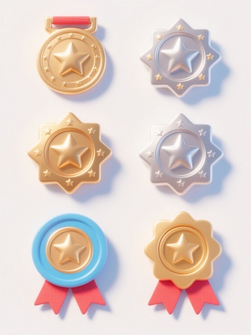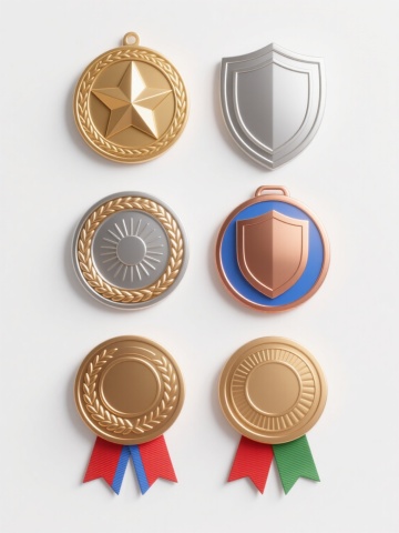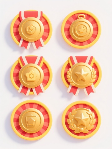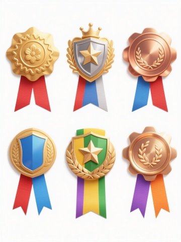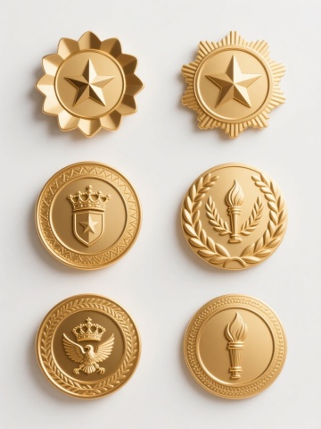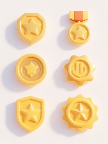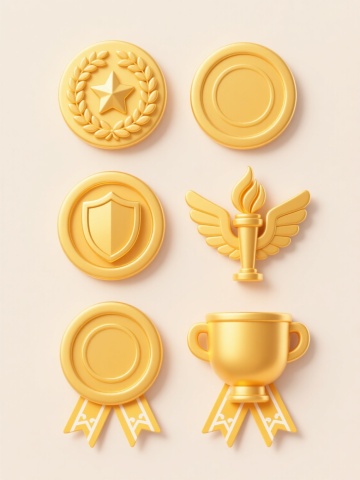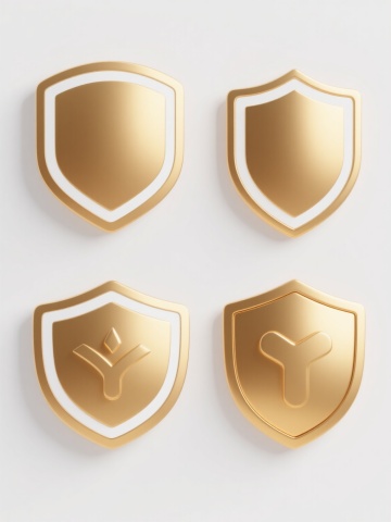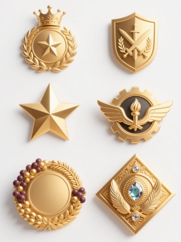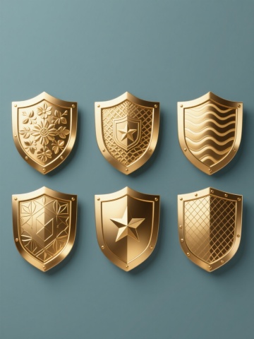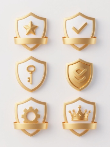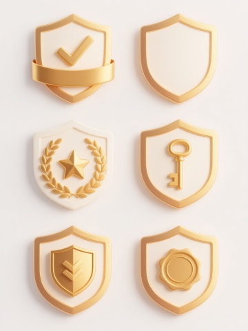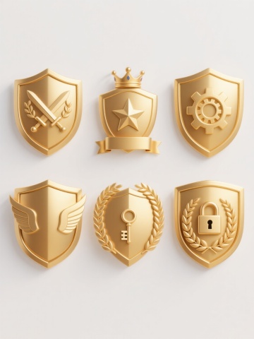 白色背景上,六个同风格金色盾牌系列素材集合规整排布。每个盾牌均保持相同的金色金属质感,带有细腻的渐变光影和精致的金色边框,呈现出光滑、有光泽的3D立体效果。六个盾牌内部分别包含完全不同的元素内容:第一个盾牌中心是简约的白色五角星图案;第二个盾牌中心是横向排列的三道白色粗条纹;第三个盾牌中心是白色的桂冠环绕图案;第四个盾牌中心是白色的城堡剪影;第五个盾牌中心是白色的交叉宝剑图案;第六个盾牌中心是白色的圆形靶心图案。所有盾牌大小一致,等距排列,整体构图对称平衡,保持统一的设计风格和视觉语言。